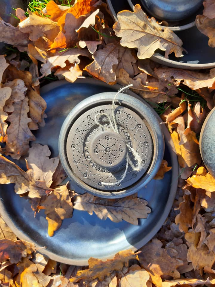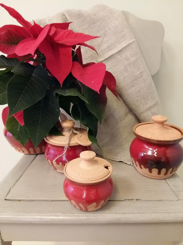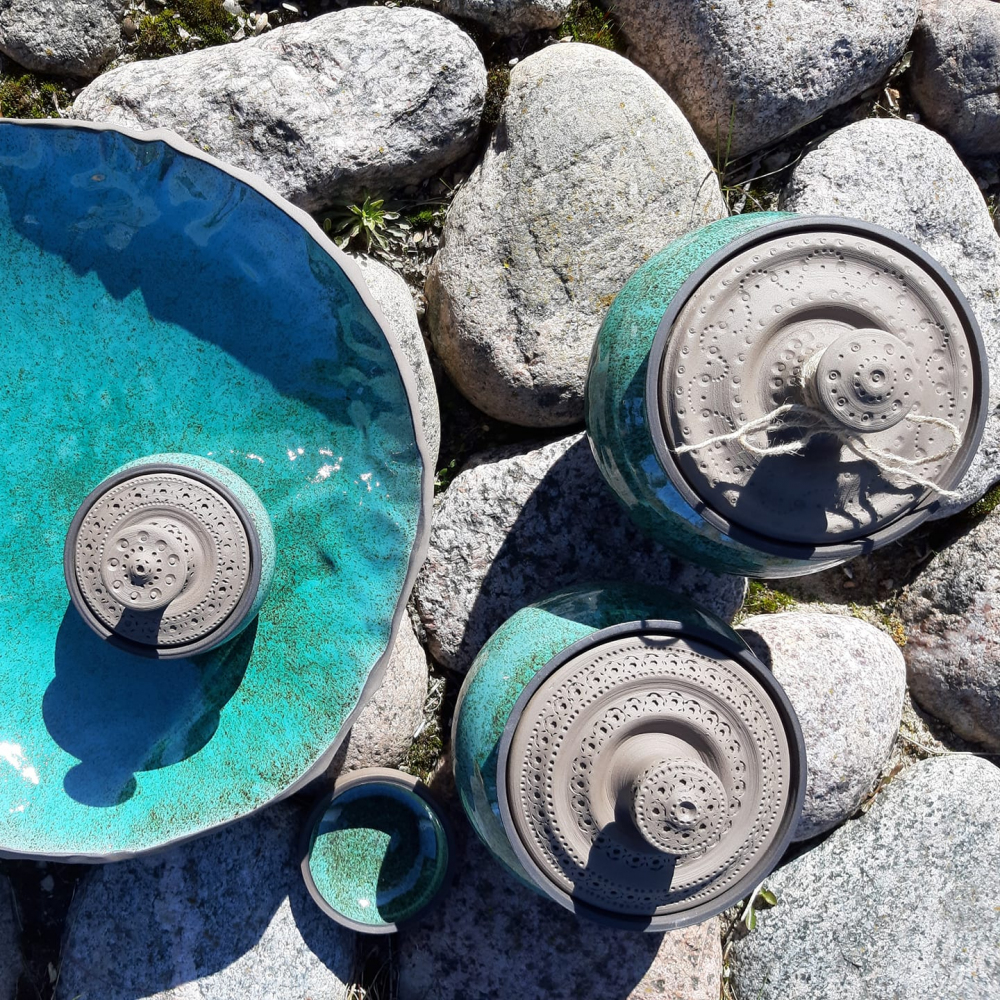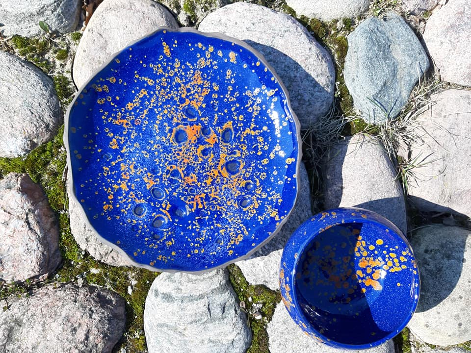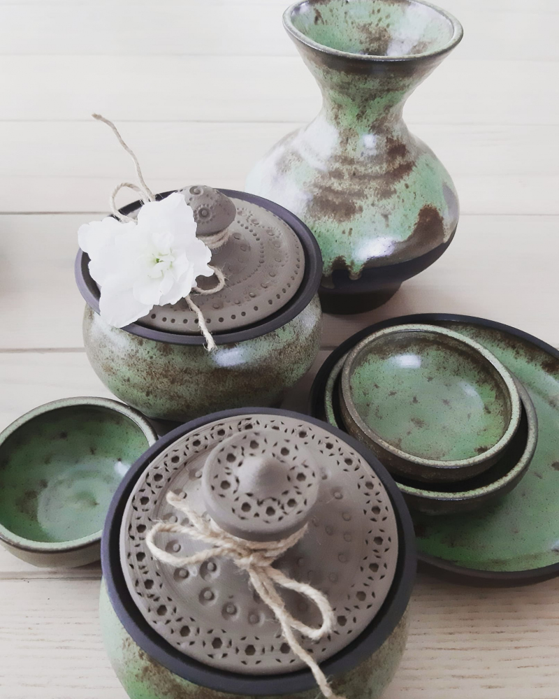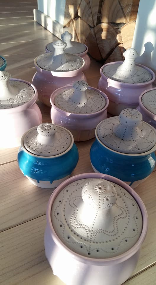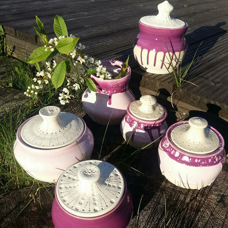 Marikai patīk podiņi ar vāciņiem, un tādu komplektiņu viņai netrūkst. Formas ir apaļīgas, sievišķīgas un domātas dažādam pielietojumam – augļiem, medum, cukuram, konfektēm, cepumiem, garšaugiem – iekšā var likt, ko vien vēlas. Domājot gan par praktisko pielietojumu, gan par formu, viņa izgatavojusi arī dažāda lieluma māla bļodas. Trauki ir glazēti, izmantojot zili zaļos, sarkanīgos, arī dzeltenos toņus.